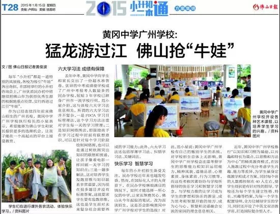 近年,广州市黄广中学推行“以知识和习惯为基础,以兴趣和特长为重点,以思维和方法为中心”的精英教育模式,在因人施教过程中充分考虑学生兴趣、能力等差异,为学生度身定做教学和成才方案。每个班人数都控制在40人左右(小学每个班30人左右),使得学生得到更有针对性的指导,为每个学生建立性格、特长、兴趣、学习、习惯等档案,再为每一个学生配置导师,全程、全方位辅导学生的学习和思想,同时还开设了中英文双语教学班,打造国际复合型人才。“我们的教育理念是情商和智商并重,方法和知识同行,能力和成绩共进。所以我们的老师都会想办法把教学和学习的科学方法糅合进有趣的课堂当中,在不知不觉、细水长流、水到渠成中完成教学,让学生自己当学习的主人,成为善于学习的智慧型学生。”范小星信心十足地回答。(文/图 佛山日报记者黄俊波)