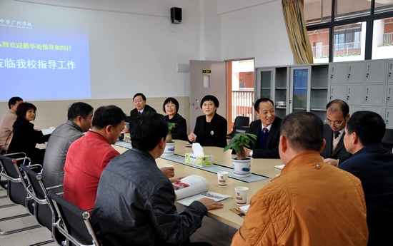 新华街党工委郭智明委员一直非常关心我校的发展。他说今天的这次到访,主要有两个目的:一是让新华街的校长们多了解一下广州市黄广中学的管理模式,从中学到一些有用的经验;另一个目的就是,看黄广模式如何结合当地实际发展。郭委员希望位处新华街的各个学校加强学习,相互借鉴,共同提高,促进当地教育事业的发展。