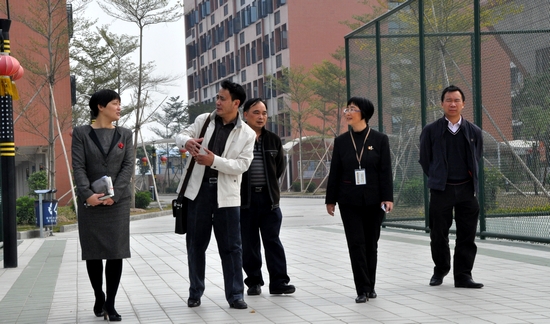三位领导参观了我校教学区、运动场、食堂、宿舍以及校园文化墙,并对我校优美的校园环境、完善的教学设施和浓郁的学习氛围给予了高度评价。李远主任更是对学生自己动手设计并布置出的宿舍文化称赞不已。李主任说到,希望广州市黄广中学继续加强对学生自主动手能力的培养,在校园文化建设方面充分发挥学生的自主能力和创新精神,彰显出黄广中学的个性。李主任还提到,校园文化建设要突出广州、花都地区的特色,开展优良传统教育,通过对广州地区发展历程的宣传,对学生进行爱国主义教育。