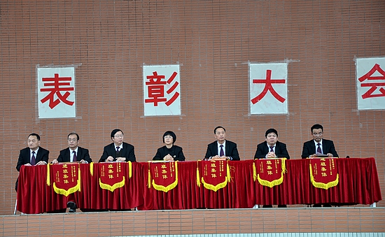 最后,学校领导给先进班集体和个人颁发了锦旗、奖状和奖品,大会在喜庆、热烈、激动的气氛中落下帷幕。