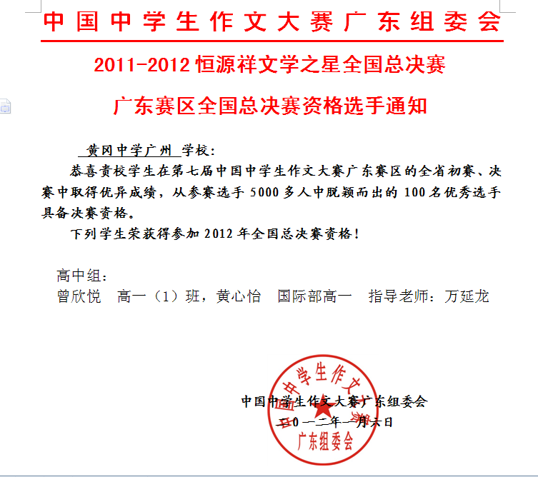 日前,全国中学生作文大赛广东组委会传来喜讯,我校高一(1)班曾欣悦、国际部高一班黄心怡两位同学,在第七届中国中学生作文大赛广东赛区的全省初赛、决赛中取得优异成绩,从参赛选手5000多人中脱颖而出获得全国决赛资格。