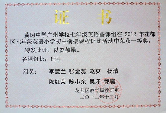 2013年1月6日,我校七年级英语组在花都区小学初中英语课程衔接评比中喜获一等奖。本次英语课程衔接评比活动是由花都区教育局组织,全区近20所中学参加本次大型课程衔接活动,参赛课题的质量都很高。本次比赛前后历时4周时间,举办方组织有序,评比过程规范,采取匿名评分的原则。最终,在评委老师的严格审查下,广州市黄广中学以绝对优势获得第一名。