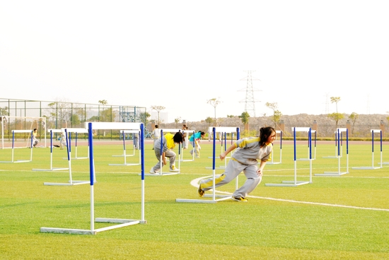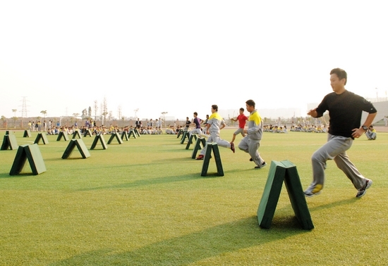 比赛从八年级15个班中,各选派10名男生和10名女生参加,按男女生分成两路纵队,分别相向站在两端起跑线后面。发令枪一响,只见第一轮1至8班的第一名男队员,像离弦的箭一样,按“S”型向前跑过四个障碍物,接着捡起地上的跳绳跳满10次,然后猫腰以“S”型穿过四道栏杆,最后跑到对面起跑线与本队第一名女队员击掌传递。第一名女队员按照男队员的方式,逆向传递给对面本队的第二名男队员,完成了一个循环。四周同学们的加油声、呐喊声、欢呼声此起彼伏,整个运动场成了一片欢乐的海洋。十个循环完成后,以时间最短者为胜。通过两轮的激烈比拼,最后八(15)夺得冠军,八(4)班获得亚军,八(11)班第三名。