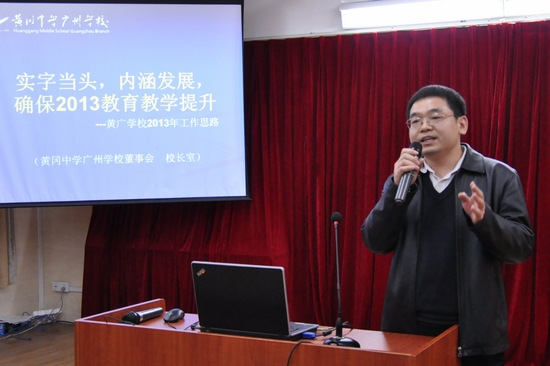 游书记强调2013年学校更大的价值就是路在脚下,他提出五句话“将务实与执行发扬光大;德育毫不放松;教学加大力度;服务要上台阶;团队要有突破”,为学校前进的五大块指明了方向。他寄语全校教职工,一份耕耘、一份收获,明确自身价值观。2013年,广州市黄广中学是实干之年、腾飞之年。