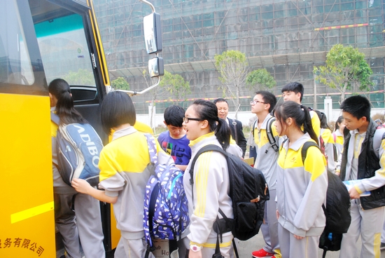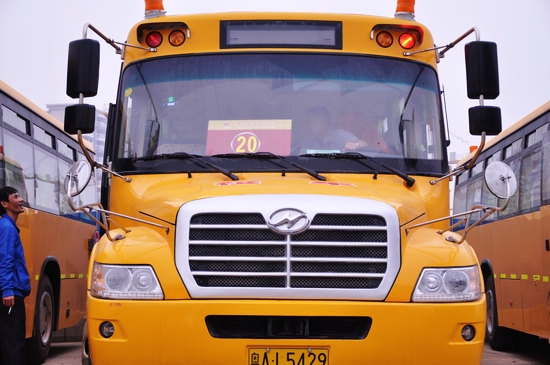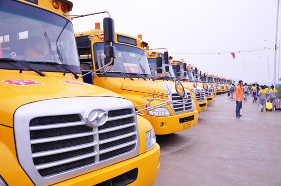 3月1日(星期五)下午2点30分,学校大门前,27辆崭新的大型橘黄色校车巴士一字排开,静候着送同学们回家。