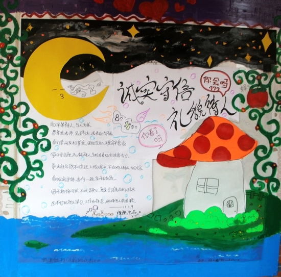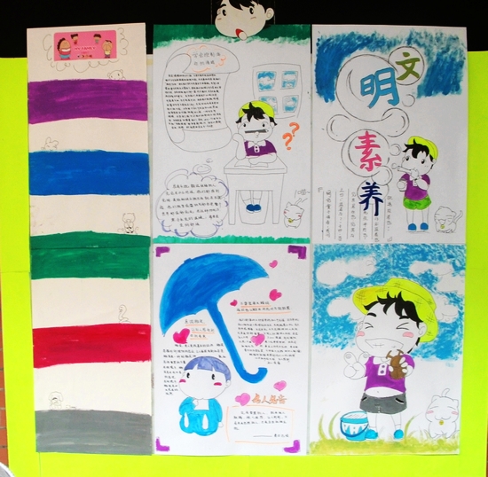 为了配合学校提出的“四个好习惯”的德育教育,创设良好的校园生活和学习氛围,3月5号起,三栋宿舍楼的师生齐动手绘制宿舍墙报。同学们不辞辛苦,牺牲自己的休息时间,认真查阅资料,绘出了一幅幅美丽的画卷。他们细致入微地绘制每一个画面,哪怕是一笔不好都要重新来过;他们精挑细选每一篇文章,不断修改,不断创新,直到满意为止。经过一个多星期的努力,一幅幅精彩的画卷展示在走廊的墙壁上,给宿舍增添了几分书香,同学们经常都会有意无意地瞄上两眼,心情得到了放松。