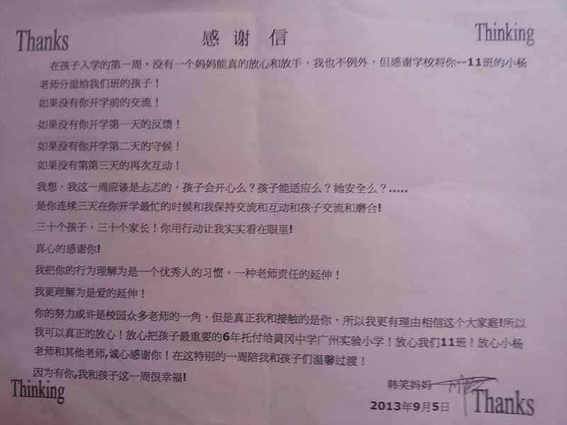 在这里,我们在感谢家长对我们工作肯定的同时,也十分感谢各位家长的理解和支持!下面是一年级一位小朋友家长的感谢信: