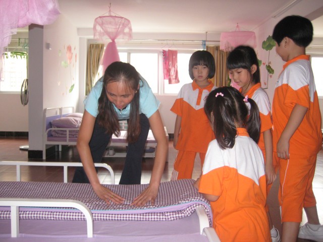 为了让学生尽快适应学校的寄宿生活,培养学生的独立生活能力,规范住宿生管理,创造一个温馨舒适、安全和谐的住宿环境,9月10日晚20:00,生活部喻凤英主管、李芬副主管组织全体生活老师,带上学生校服、被子下到各个班级对所有住宿学生进行培训。