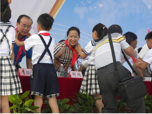 (黄广小学少先队员为花都区人大副主任邵靖女士佩戴红领巾。)