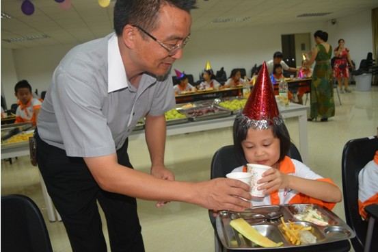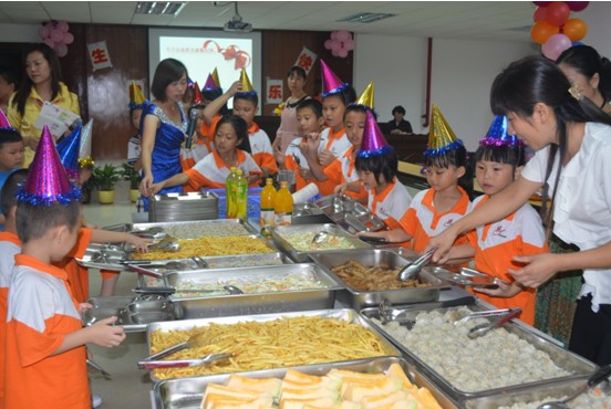 此次活动由生活部精心策划,精心准备了蛋糕、薯条、鸡翅、果汁,水果等精美食品,寿星们选着丰富的自助餐,吃着可口的美味佳肴,脸上洋溢着幸福。“我从来没有这么隆重的过生日,今天和这么多小朋友一起过生日,好开心!好幸福!”小寿星吴亦佳啃着鸡翅乐滋滋地说。