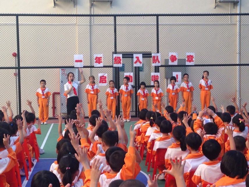 为帮助孩子顺利争章,仪式上少先大队辅导员谭英老师向一年级小朋友介绍争章要求后,着重进行队知识学习,含少先队的全称、入队的意义、少先队的礼仪、呼号、誓词等基础知识。