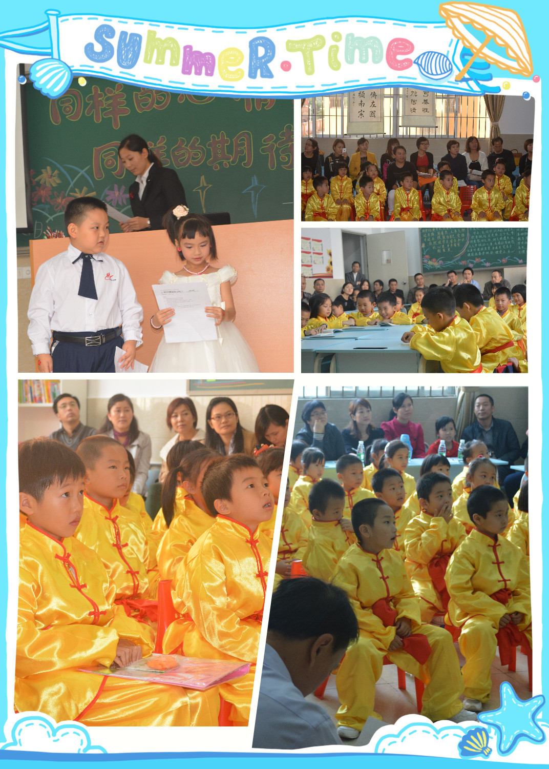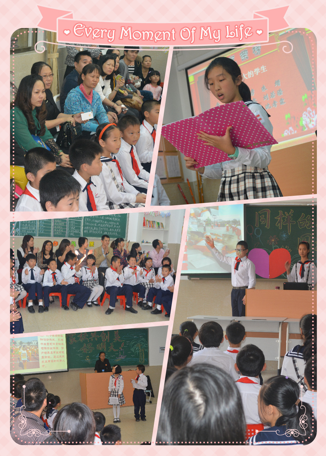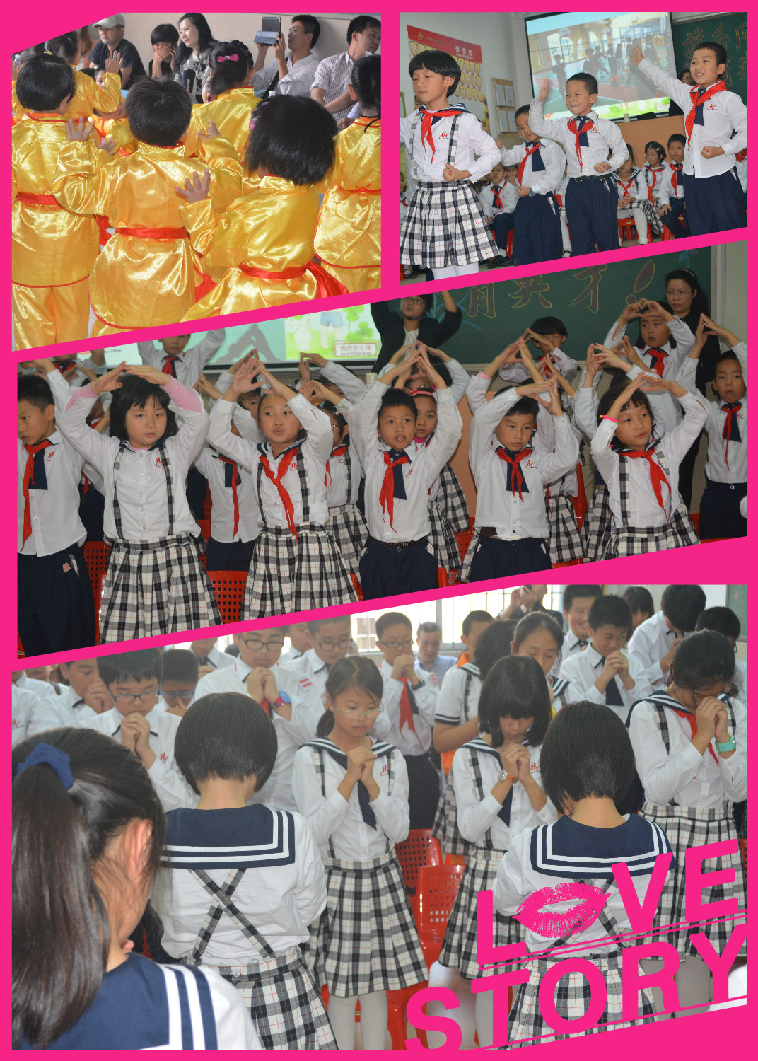 活动分集中展示、班级展示、个别交流三大部分进行。集中展示环节对我校前期大型武术团体操、国学操、大型集体舞、经典诗文诵读活动进行展示。班级活动主要从学生行为习惯、学习习惯、生活习惯养成教育、班级管理与活动、学生才艺展示等方面进行展示。在这一方案指导下,各班班主任充分发挥个人才智,进行了“心愿心语”、“家校总动员”等形式多样的亲子教育、感恩教育活动。