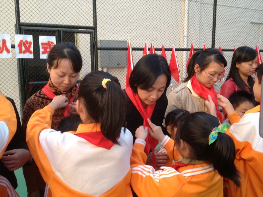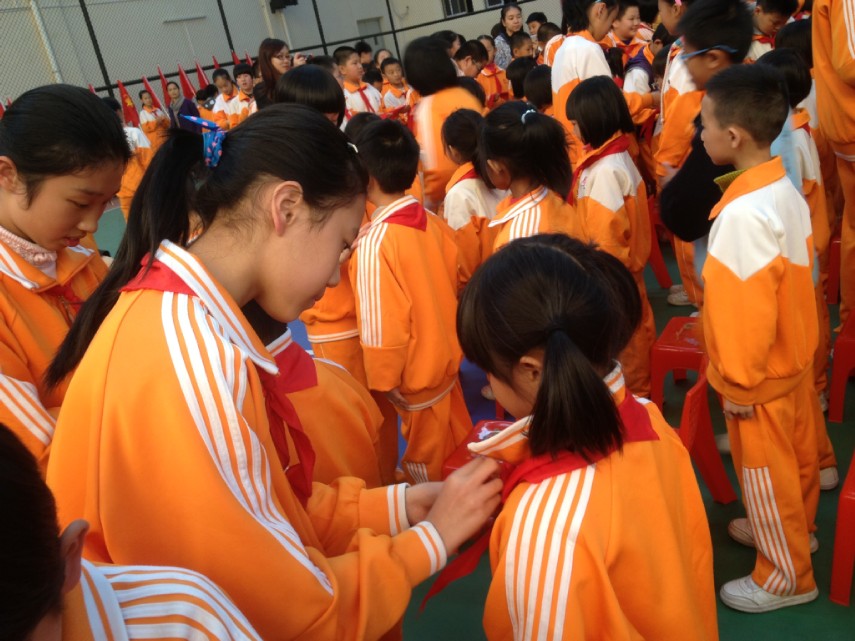 入队仪式中,四、五、六年级的大哥哥、大姐姐手捧鲜艳的红领巾登场,庄重地为一年级的小同学戴上。胸前的红领巾迎风飘起,新队员与老队员互行队礼,相视一笑,内心里充满幸福与激动。