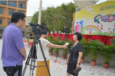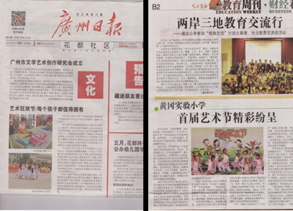 二、媒体纷纷报道我校首届艺术节。4月19日,黄广小学广州学校实验小学内歌声如潮、掌声如海,一片欢乐的海洋,近八百名师生同台献礼艺术节。花都区教育局陈维新副局长、成教科罗婷科长等领导出席,活动面向社会开放,吸引2000多名家长全程观摩。花都区花都电视台、《今日花都》、《广州日报》等媒体纷纷报道。