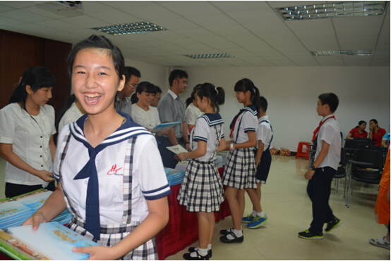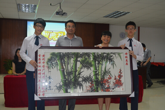 教务处王炯主任代表学校向全体学生赠送了《国学经典读本》和毕业留念册,学生代表张裕鹏、熊凯向学校回赠了巨幅画作。