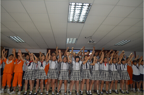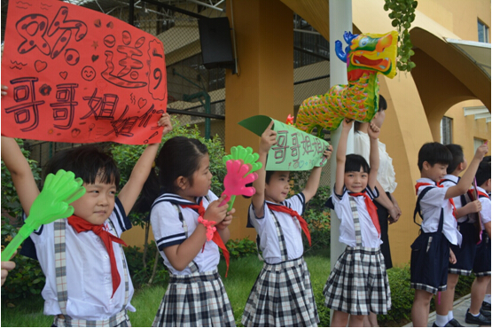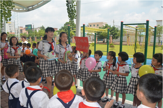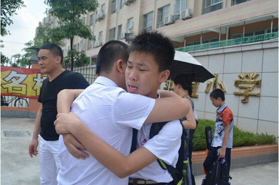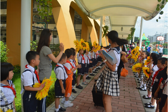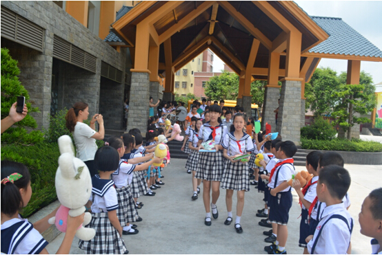 孩子们在父母的陪伴下,提起行囊,依次走出会场。门外,少先队鼓号队列队肃立,锣鼓喧天。从学校综合楼到北门的路边,小学一至五年级孩子夹道欢送。