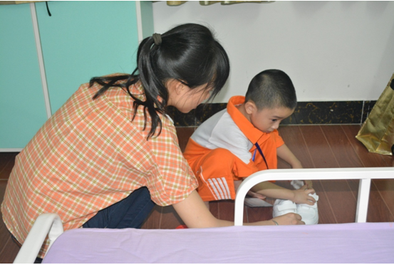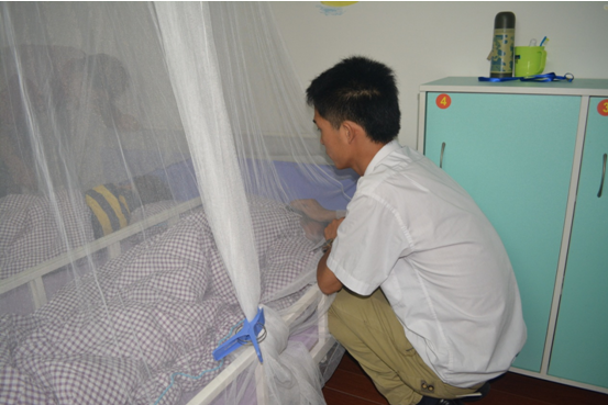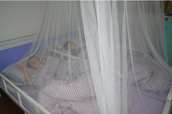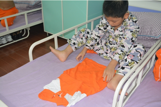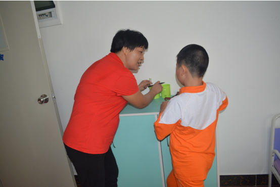 晚上8:00,全体教师深入学生宿舍,配合生活教师进行生活自理能力训练,教会学生挂蚊帐、洗漱等。