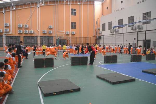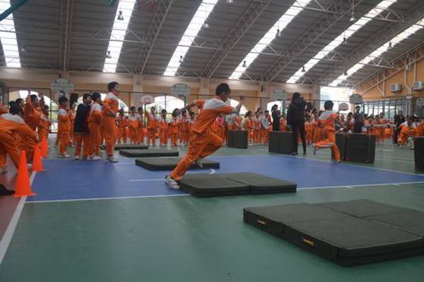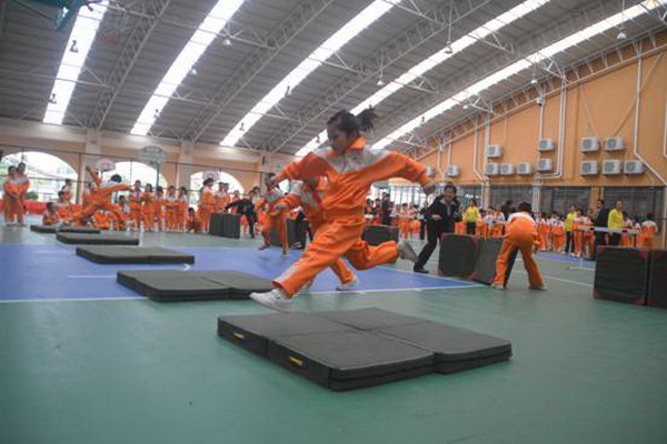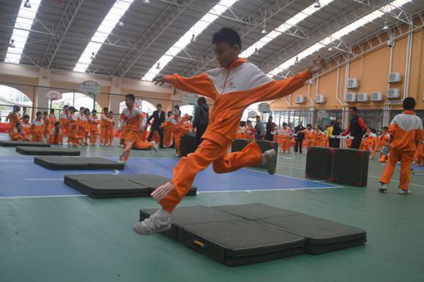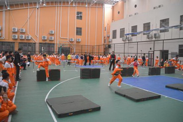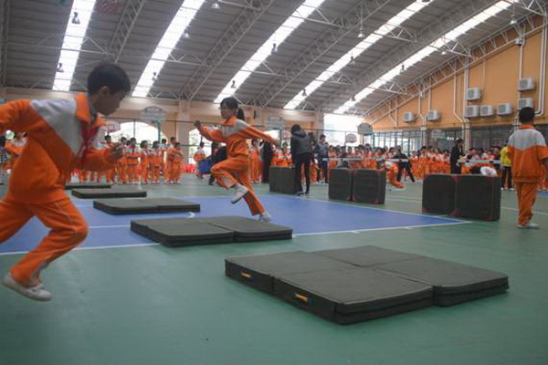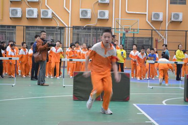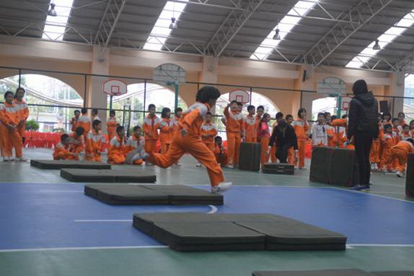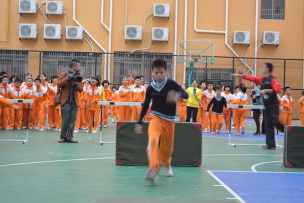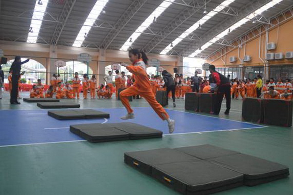 “跋山涉水”项目,赛道长15米,参赛选手需钻过跨栏,跨过竖起的体操垫,跳过平铺的体操垫,来回往复。