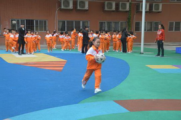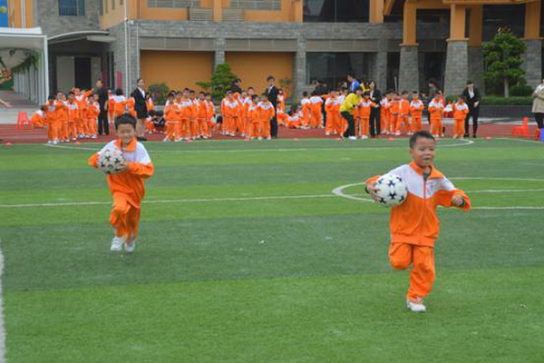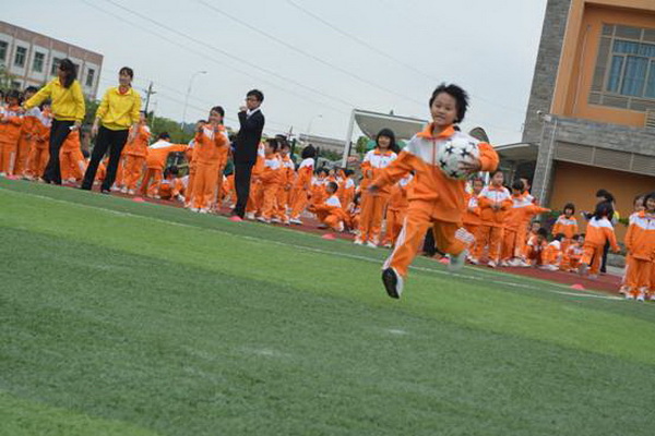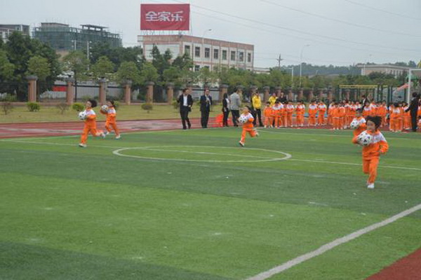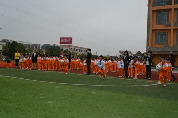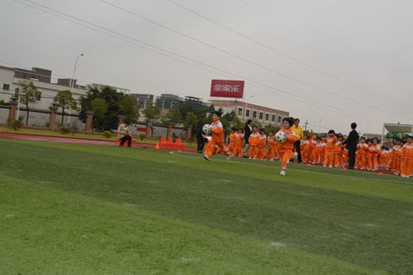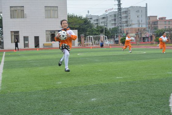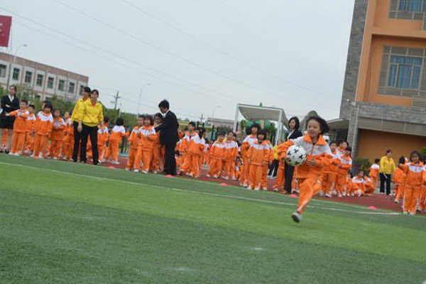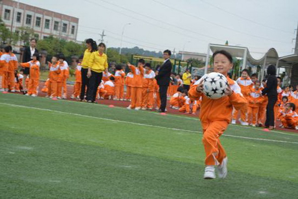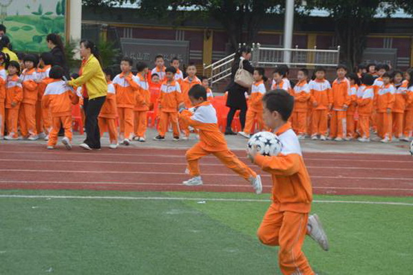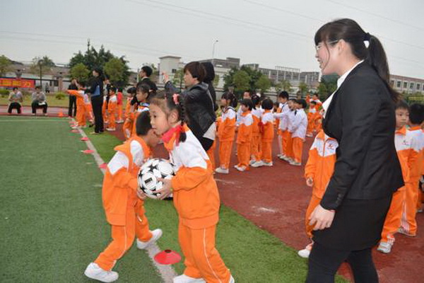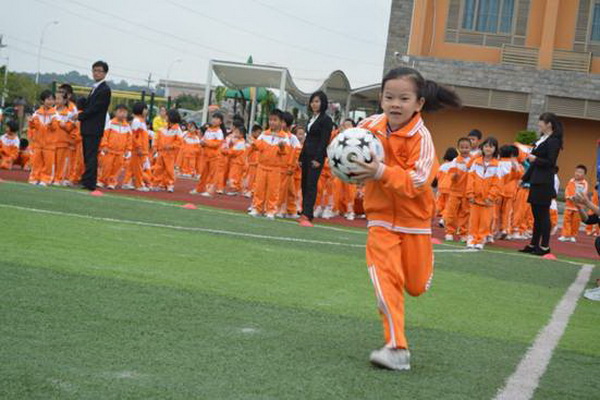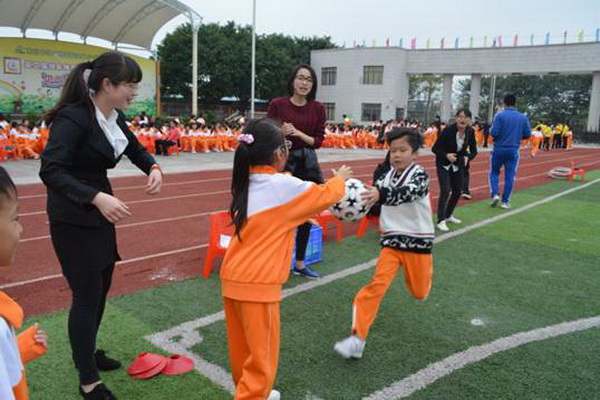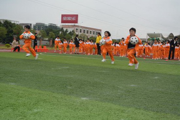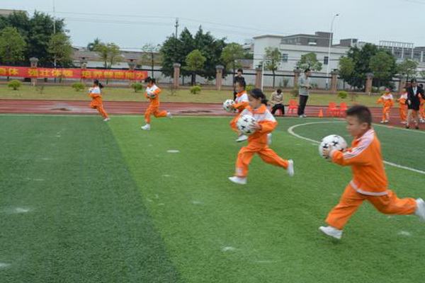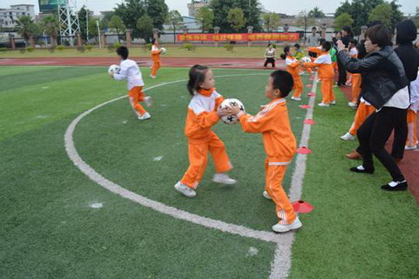 抱球接力比赛,听到裁判哨声,抱球向前奔跑,绕过障碍物返回,将球传给下一位同学。奔跑过程,球不得落地。一、二年级设此项目。