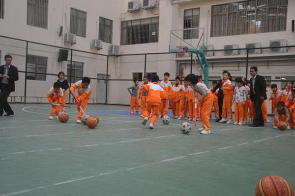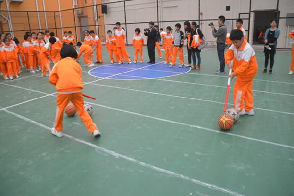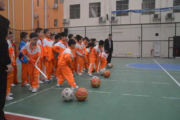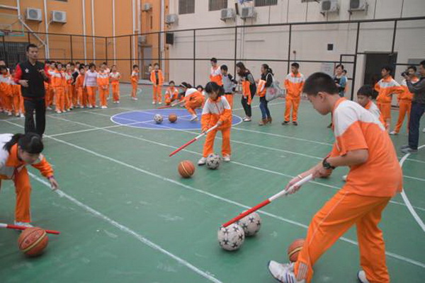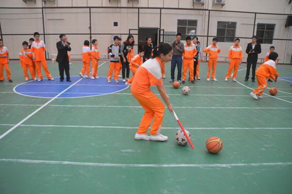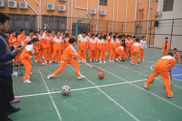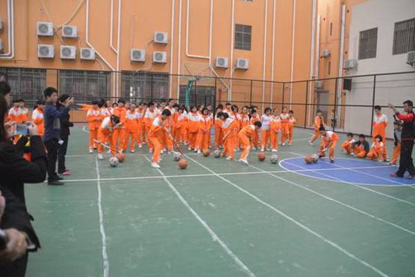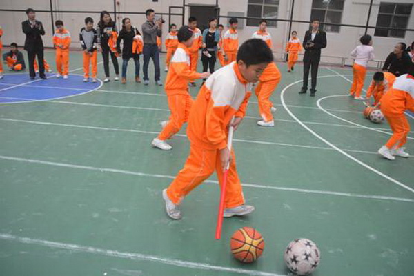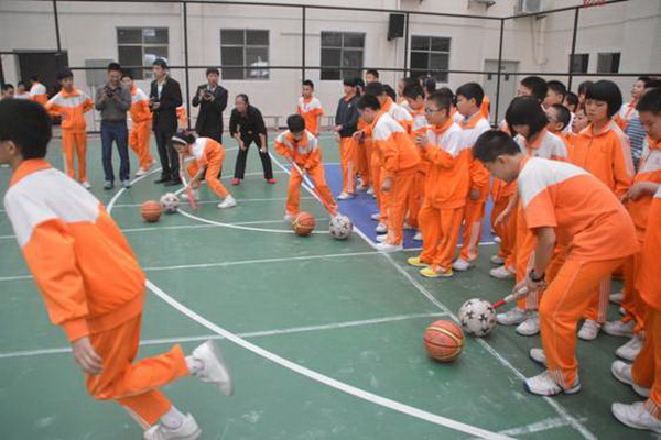 赶“猪”跑项目,参赛队员用体操棍拨大小两球,将“猪”(篮球和排球)赶向对面队友,赛道长20米。中、高年级设此项目。