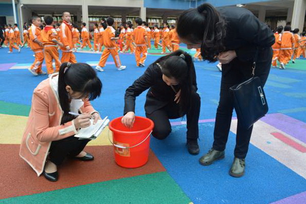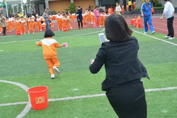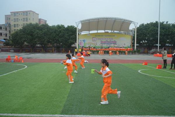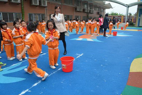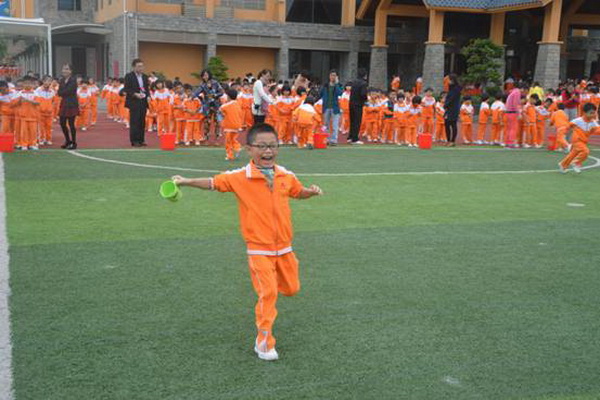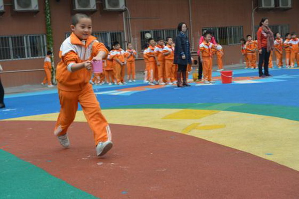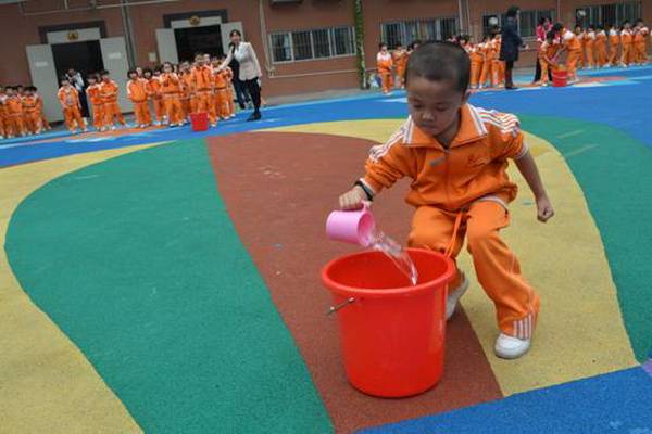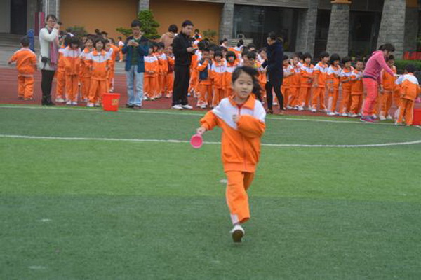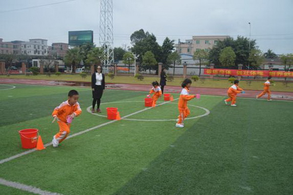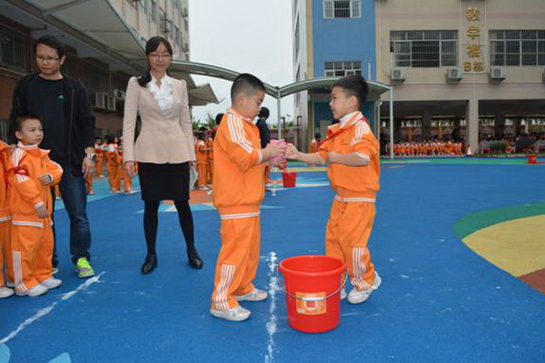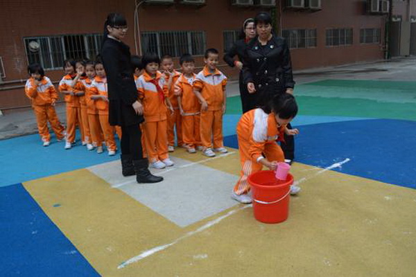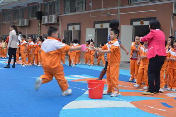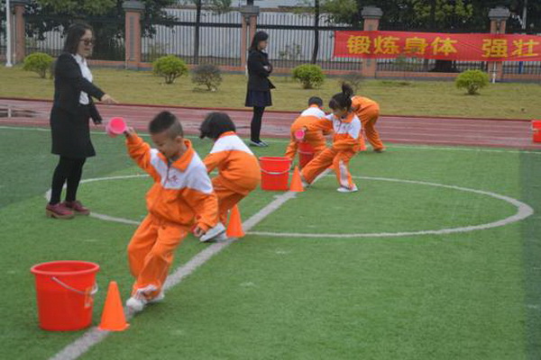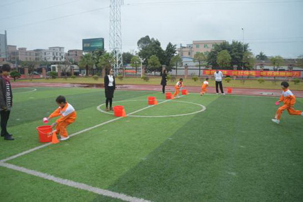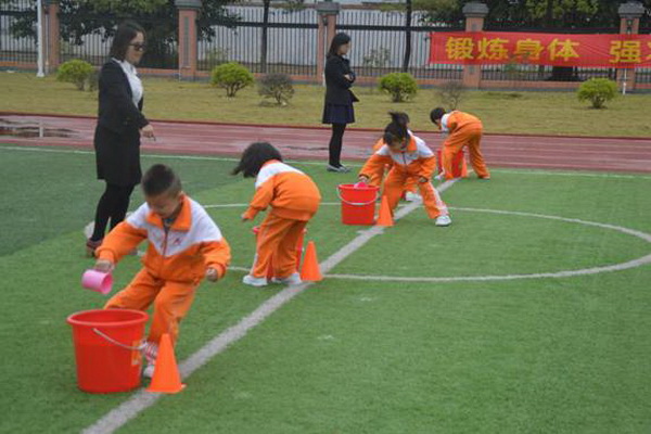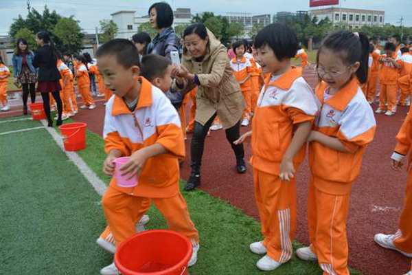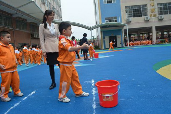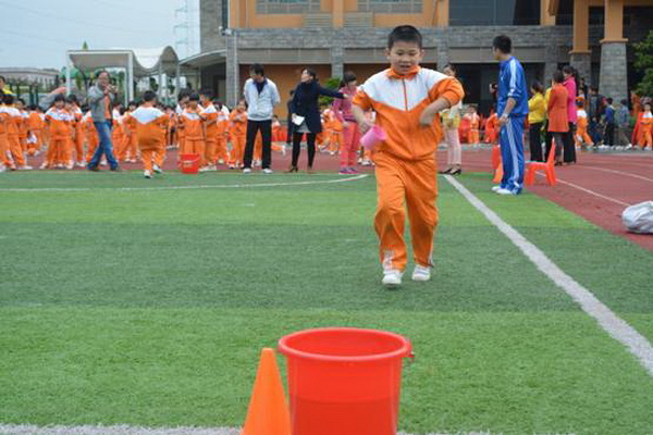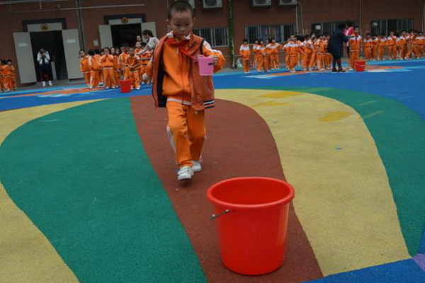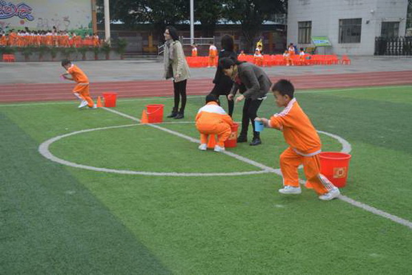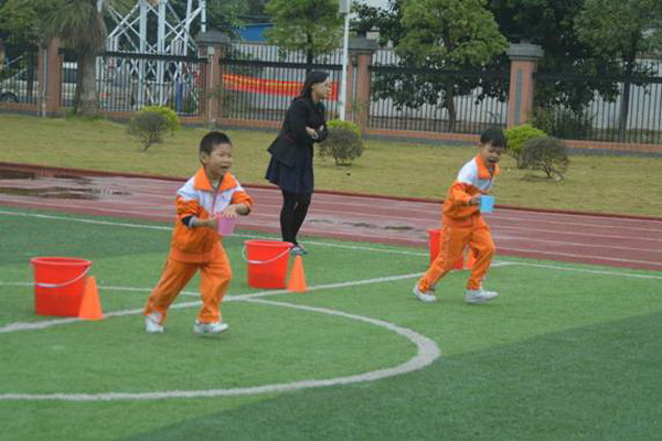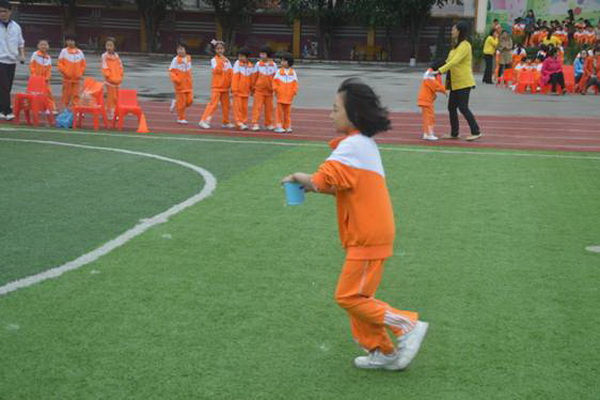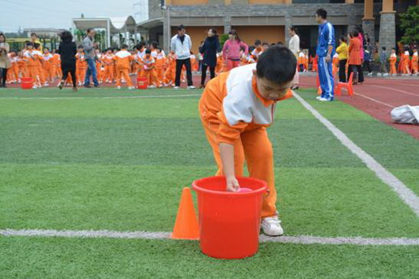 争分夺秒项目: 参赛队员排一路纵队站起跑线外,裁判哨响,手拿空杯迅速起跑,在前方水桶盛满水后,绕过障碍物,原路返回,将杯中水倒入指定桶内。4分钟内,以指定桶内盛水量多取胜。一、二年级设此项目。