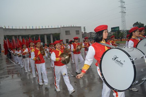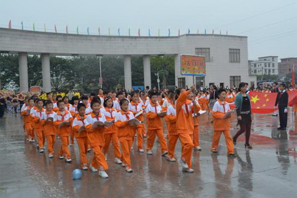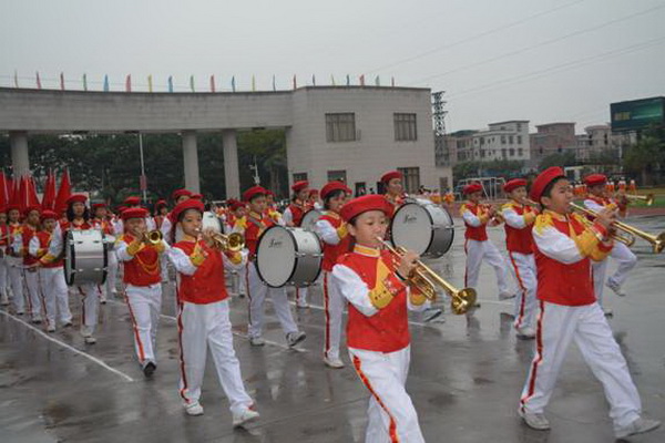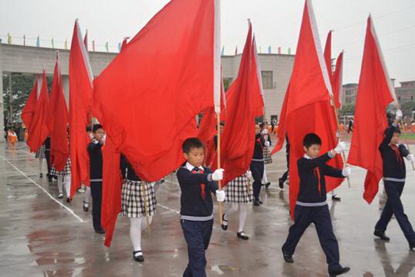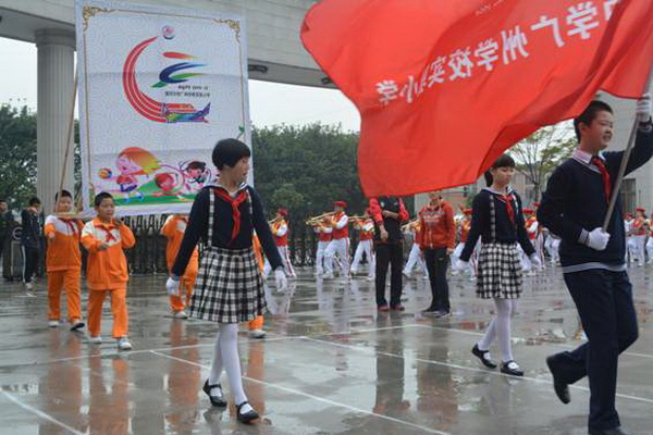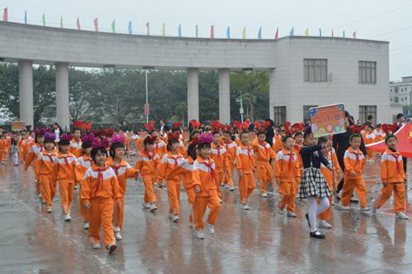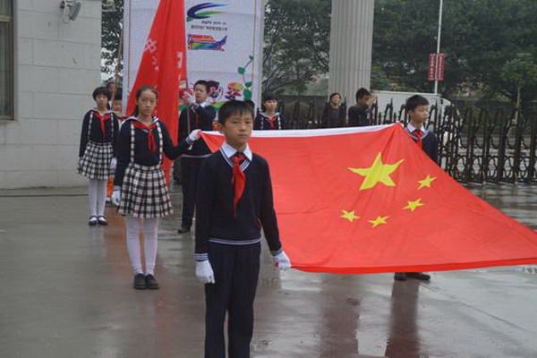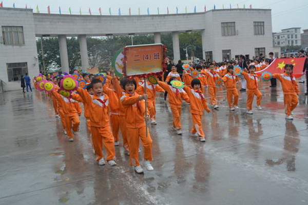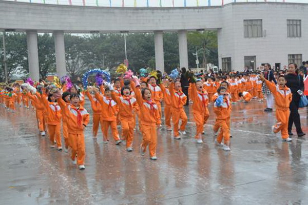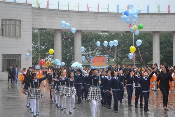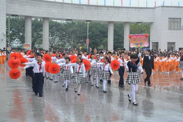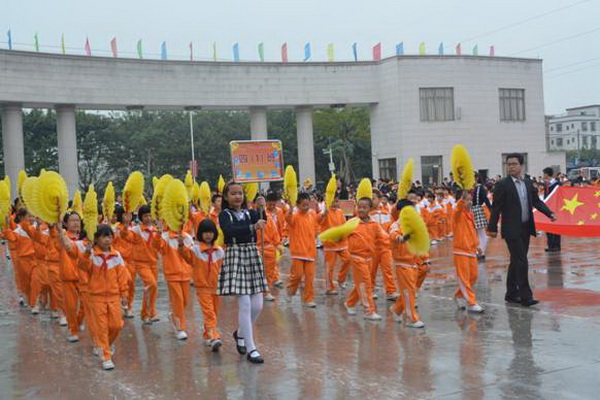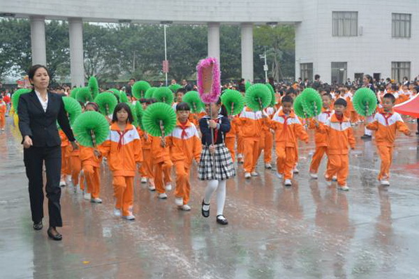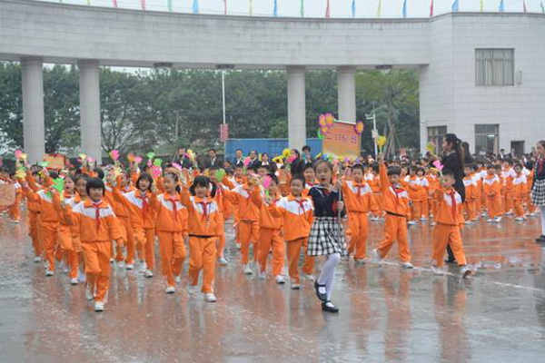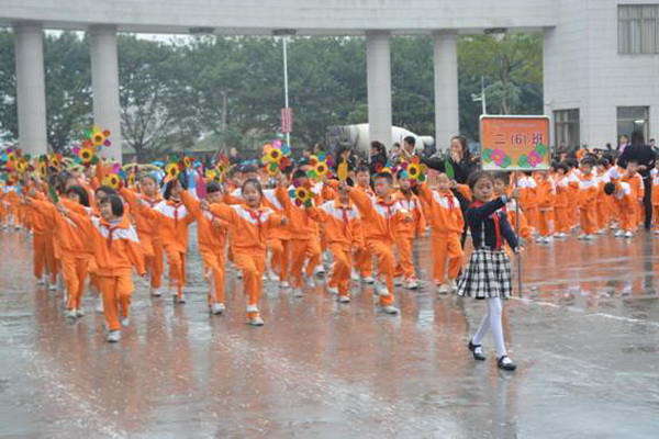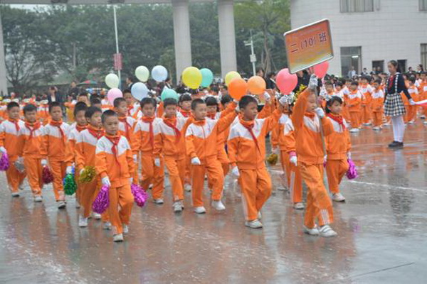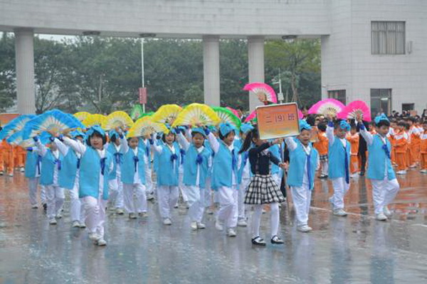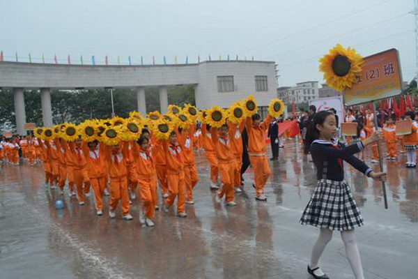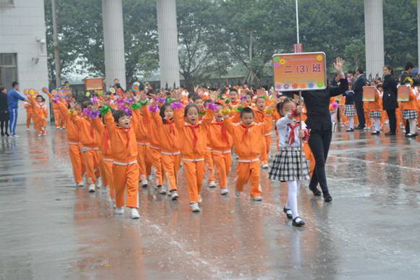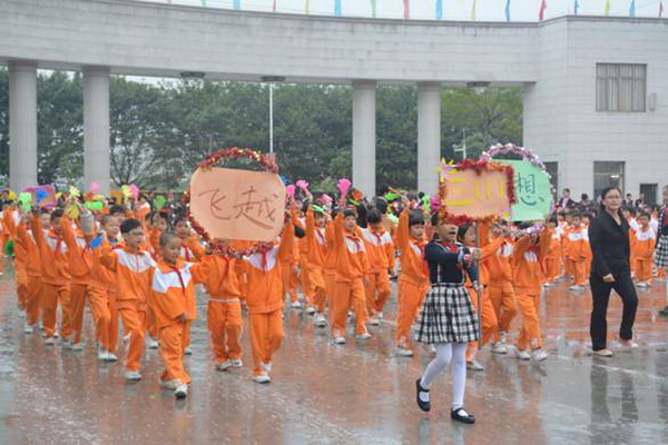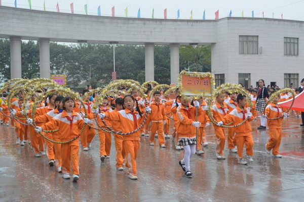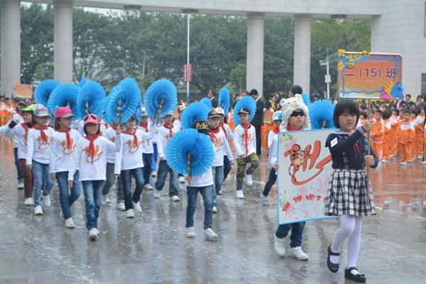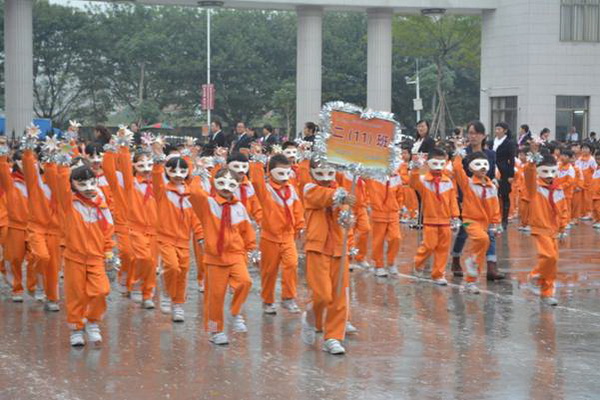 各班根据班级文化,从队员的服饰到道具装饰,从口号到队形进行了精心贴切的设计,可谓匠心独运,不拘一格。各班方阵色彩明丽、整齐划一、口号响亮,以饱满、激昂的精神状态一一接受检阅。二(9)“蓝精灵”班孩子“羽扇纶巾”,身穿蓝白相间的汉服,踏着方步,口诵三字经,出现在宏大的开幕式现场,显得格外抢眼;五(1 )班现场放飞的氢气球、六(1)现场燃放的礼花赢得孩子们阵阵欢呼。