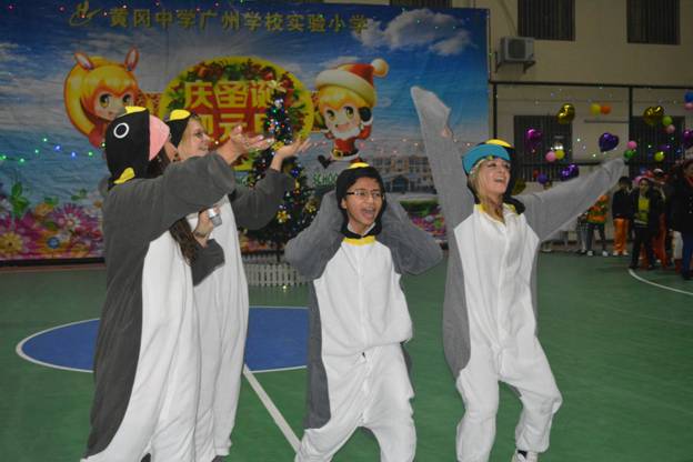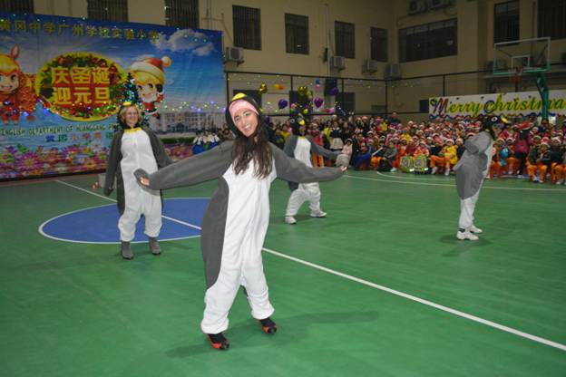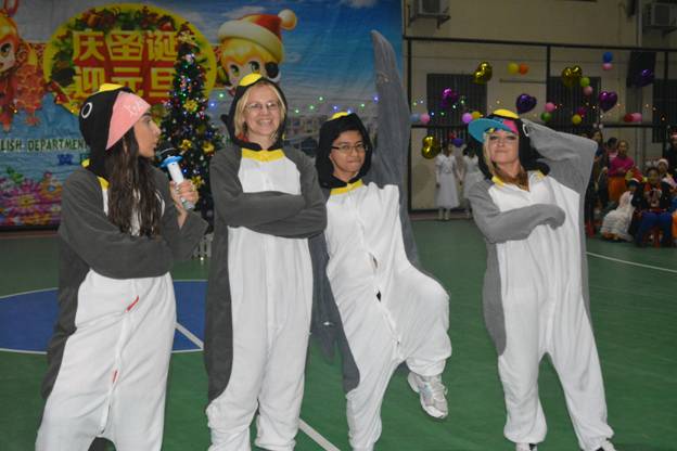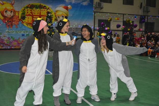 首先热场的当属我们的外教Rita、Olga、Karina、Aretha 。她们身着活泼可爱的企鹅服饰,扭捏的姿态、纯正的口语以及动感欢快的舞蹈表演——《Po pow pay》震撼了全场。