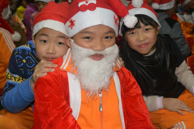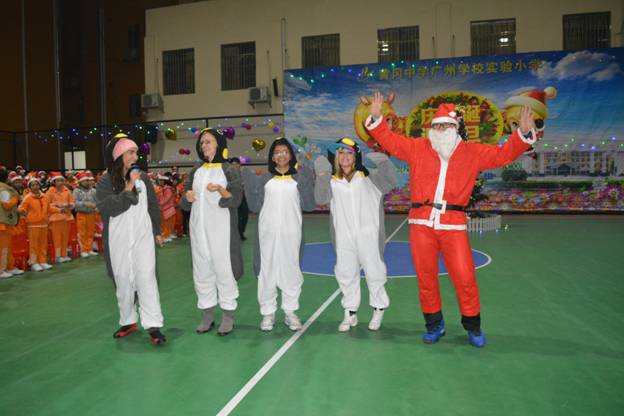 在外教期待声中,所有孩子第一次目睹了慈祥的圣诞老人——孩子们眼中可爱的体育潘健铭老师,现场惊呼一片。