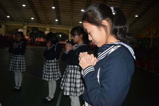 瞬间,灯光熄灭,孩子们屏气凝神。身着礼服、手捧烛光的12个孩子,伴着深情的音乐,从舞台两侧款款走来,随着队形的变幻,伴着音乐的节奏,孩子将手中的烛光时而捧在手心,时而擎过头顶,绕着圣诞树围成一圈,双手合十,闭上眼睛,许下新的一年美好的愿望。