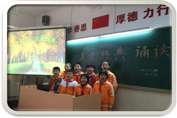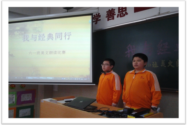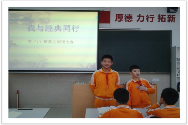 为了让学生“读千古美文,传华夏文明;诵中华经典,做少年君子”,3月9日,语文科组继第一周的“成语想像画”之后,紧接着在第二周举行“亲近美文,走进经典”朗诵比赛。