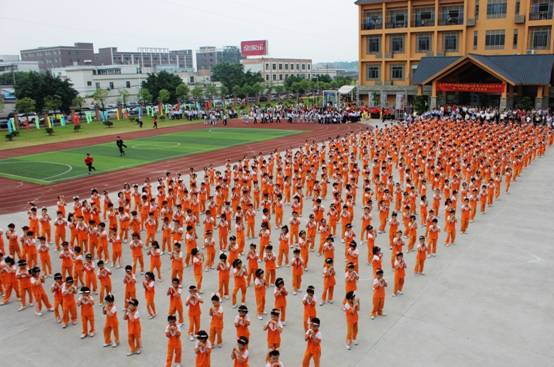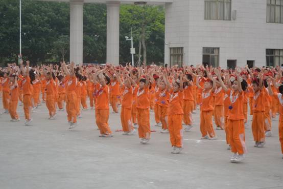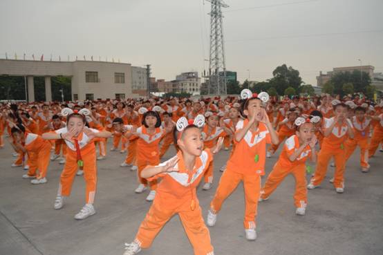 一年级600多名同学头戴“喜洋洋”头饰,呼啸奔跑,冲入操场中央,布成方阵,陶笛吹奏《大家一起喜洋洋》。欢快的乐曲中,方阵呈几何图形变换。