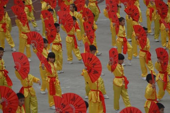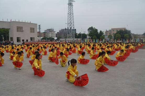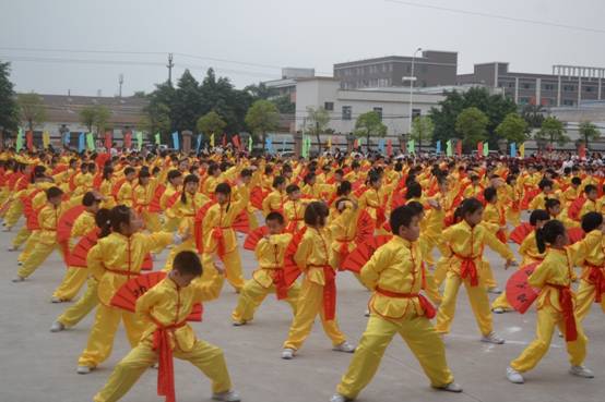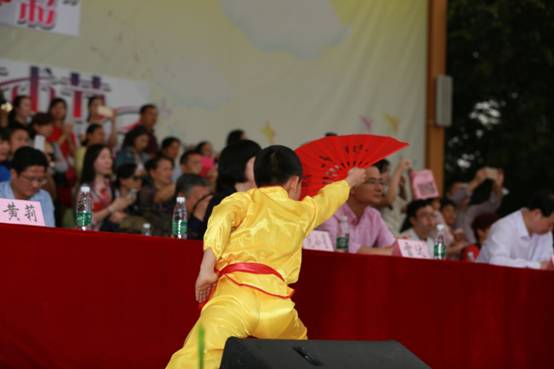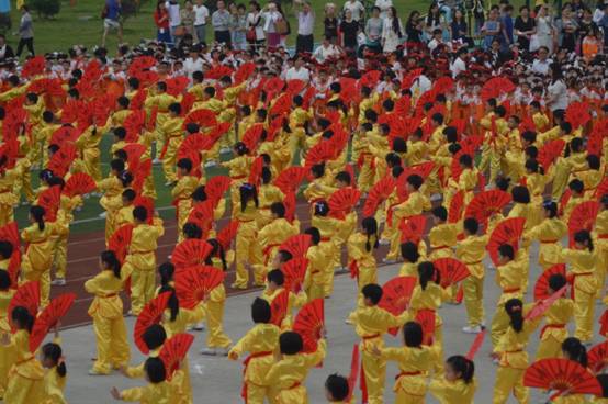 随着一声清脆的炸响,400多把太极功夫扇悠然舞动,齐刷刷的开扇声,刚柔相济,响声震天……