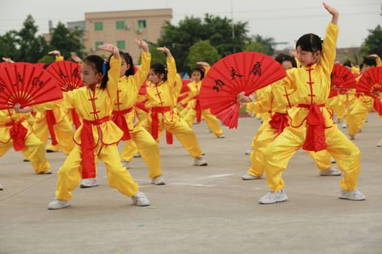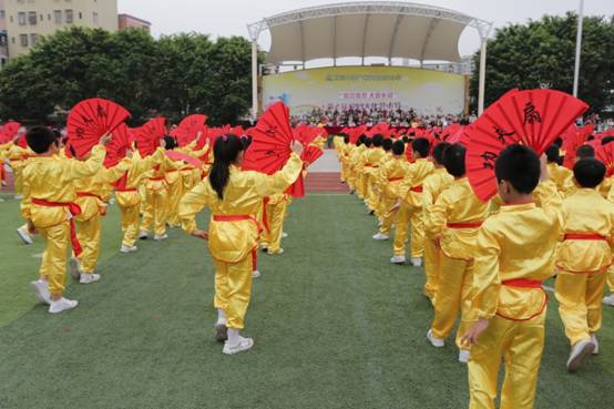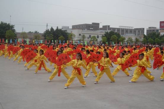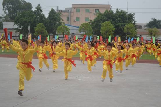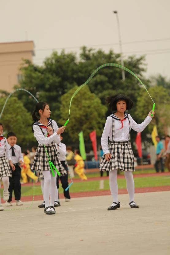 随后,操场中央同时出现花样跳绳、戏剧花脸、武术套拳、国标舞蹈等串场表演,场上一排欢腾嬉戏。