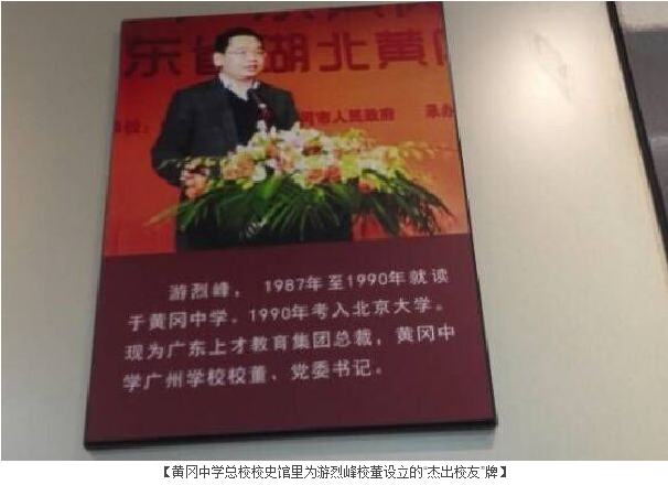 据悉,2015年6月,黄广中学总校在校史馆专门设立“杰出校友”版块,刊载了60年以来自黄广中学毕业的杰出校友事迹。我校创办者之一、黄广中学1990届校友、游烈峰校董位列“杰出校友”之列。