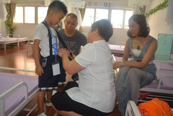 为了给孩子注册报到提供便捷服务,每班配备5名老师,每间宿舍安排了3名生活老师。教室外接待组有的采集信息,有的收集资料,有的开具缴费收据,有的在教室内接待学生,分发校服、书包。
