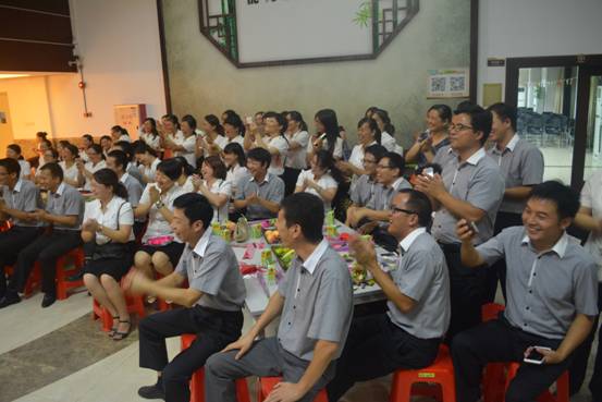 热情洋溢、振奋人心的讲话过程中,穿插了由各个学科组精心排练的节目,其中英语科组带着3位男教师、32位女教师为大家带来一场爆笑的表演——《三个和尚》,引得在场观众欢呼声、掌声不断;艺体科组伴着抗战胜利70周年的余音,上演了一场精彩绝伦的表演唱《地道战》,再现抗日当年的英勇气概,表现出黄广教师昂扬向上的精神风貌,将活动推向高潮。