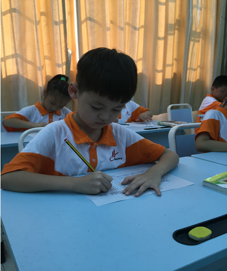 活动中,课室静悄悄的,只有铅笔和本子摩擦的声音,老师不时提醒孩子们“头正、身直、臂开、足平”的坐姿和“一尺、一拳、一寸”的执笔手势,孩子们心中铭记老师反复提醒的“先认后写”,努力做到心静、字美。