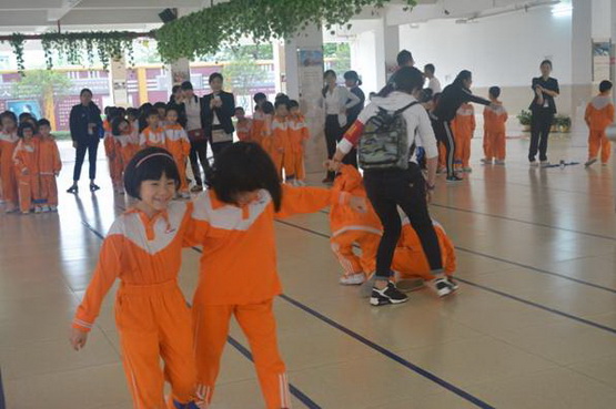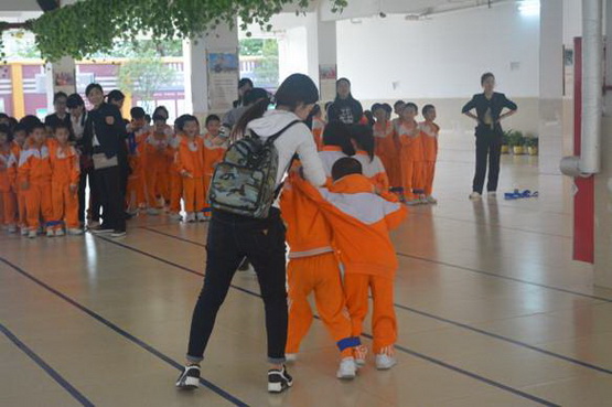 家长志愿者及时搀扶即将跌倒的孩子。