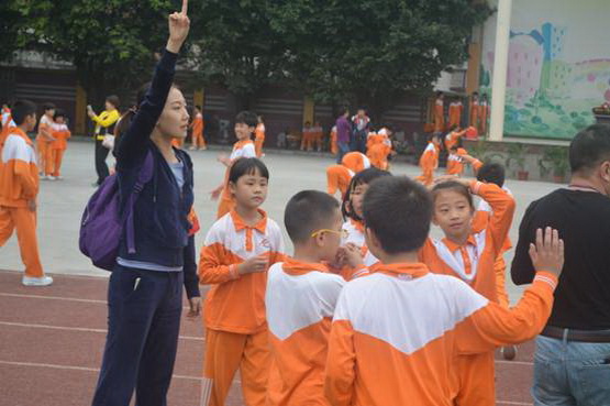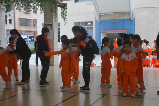一分钟跳绳过程中,家长志愿者立刻给孩子做衣着处理。