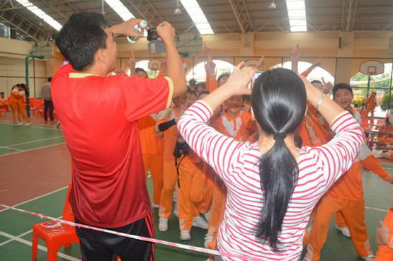 比赛前,家长志愿者细心地将女孩的长发束起。