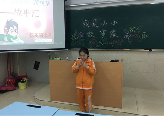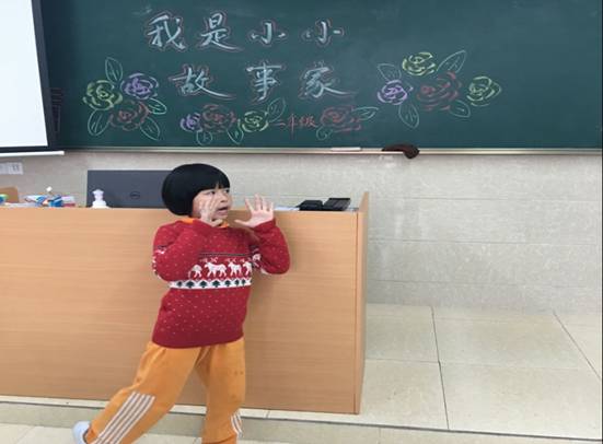 现场20名选手展开激烈的比拼。来自二(10)班的曾书颜同学扛着自制的小锄头,戴着小草帽,围着一条汗巾,把一个《拔苗助长》的农夫形象表演得活灵活现;二(5)班的郑婷婷同学以丰富的表情,恰到好处的动作,生动形像的讲述赢得了大家的阵阵掌声,把《楼上楼下》这个故事演绎到了极致……