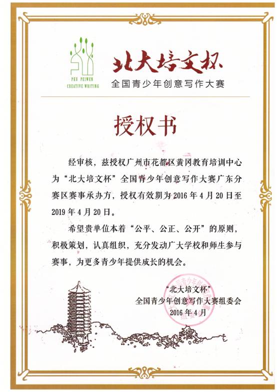 近日,在完成合作协议签订后,“北大培文杯”全国青少年创意写作大赛组委会向广州黄广教育培训中心(黄广教育集团下属机构)颁发授权证书,授权黄广教育培训中心为“北大培文杯”全国青少年创意写作大赛广东分赛区的赛事承办方,负责该大赛广东赛区的组织和承办工作。