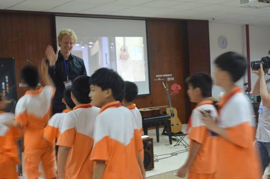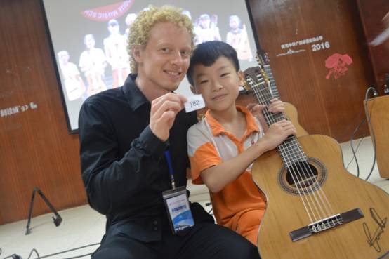 音乐会中,莫勒先生以抽奖的方式馈赠一把签名的吉他作为幸运纪念物,三(15)郭峻豪同学幸运中奖,赢得现场孩子们羡慕不已。