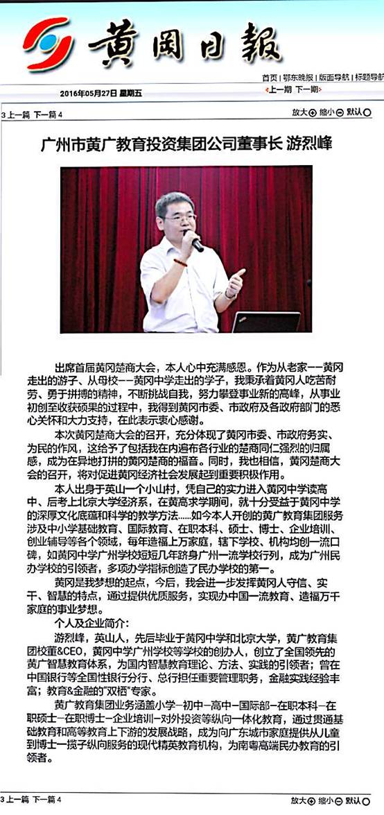 近日,黄广教育集团校董&CEO、广州市黄广中学主要创办人游烈峰接受《黄广日报》采访,表达了对黄广市委、市政府和各级部门对学校的大力支持表示感谢,同时表达了“办中国一流教育,造福万千家庭”的事业梦想。