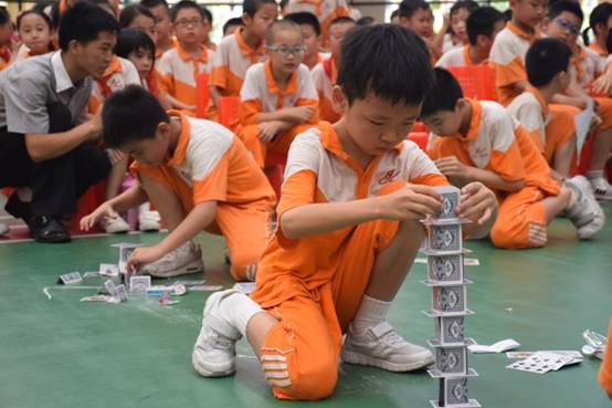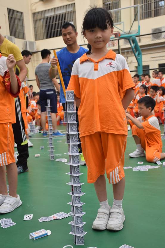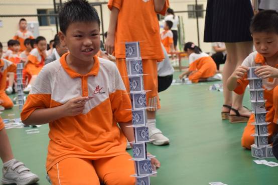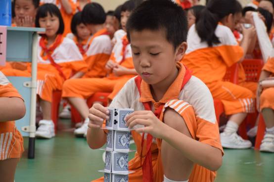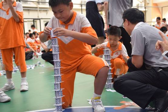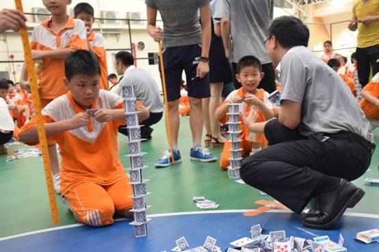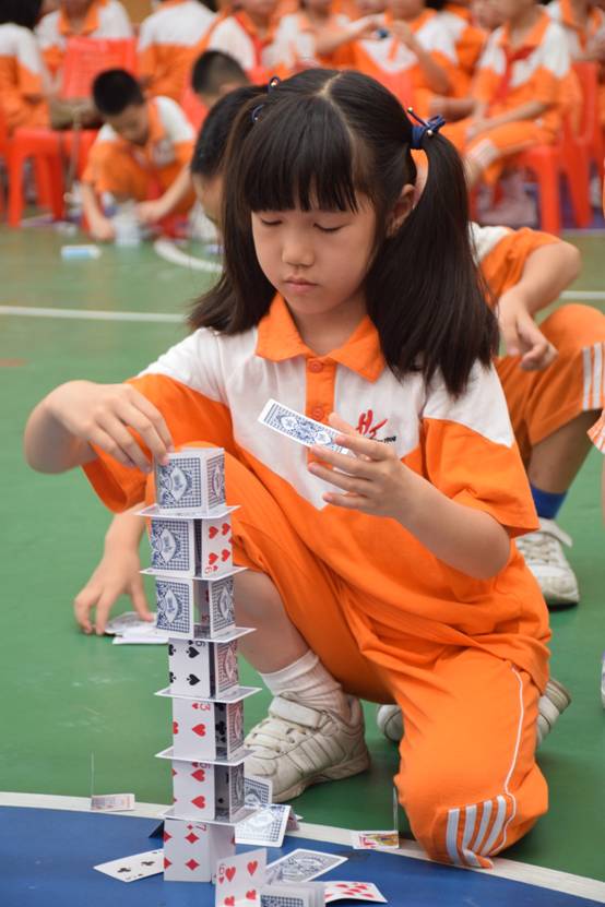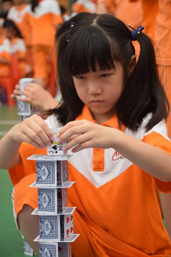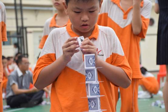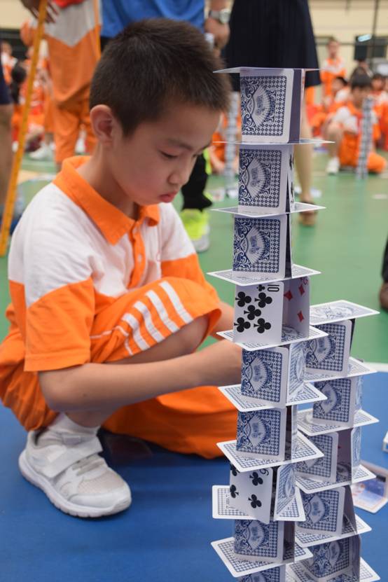 裁判老师一声令下,参赛选手们就开始专心致志地摆弄眼前的纸牌,一边折,一边动手搭高。
