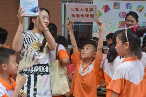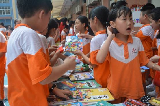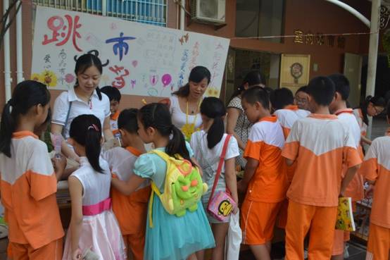 “走过路过不要错过!只要买两件小商品就可以抽奖一次哦……” 瞧孩子们卖力地吆喝着。摊位前挤满了脑袋,有推荐小商品的、有介绍优惠方案的、有收钱找钱的,个个忙得不亦乐乎。看到老师来了,这些“小商贩们”赶紧抓住机会凭着三寸不烂之舌向老师一一兜售,老师也被他们的热情感染了,高兴地买下了他们的书……