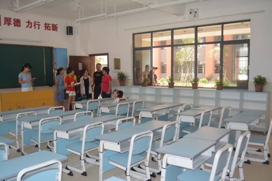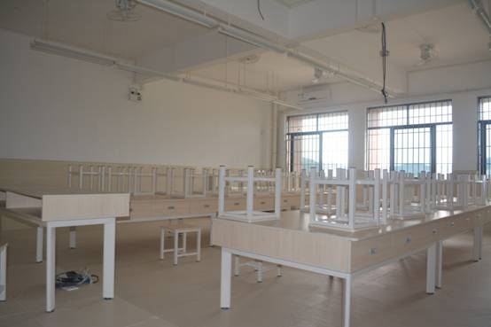 教学楼今年暂定开放A栋,共48个教学班。教室南北对流,通风效果很好,设置黑板、投影仪设备等,每个教室配备了独立的书包柜。