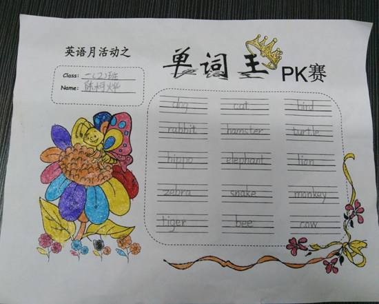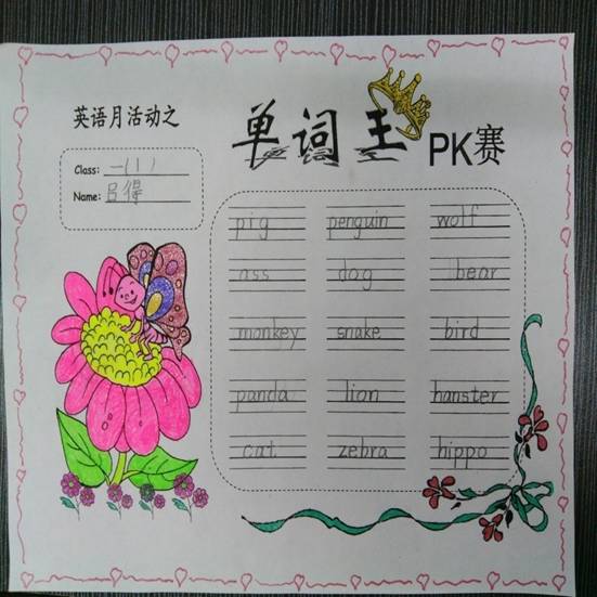 活动分为规范书写单词,创意涂色和集中展评两个环节。孩子们通过在规定的时间内正确书写单词,发散性思维想出更多的单词,给完美的“答卷”再锦上添花进行设计,作品通过班级展评,师生互评等方式选出优秀作品。