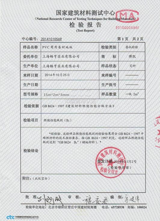 国家建筑材料测试中心检测的舞蹈室PVC胶地板报告显示:符合质量和健康标准,检测合格。