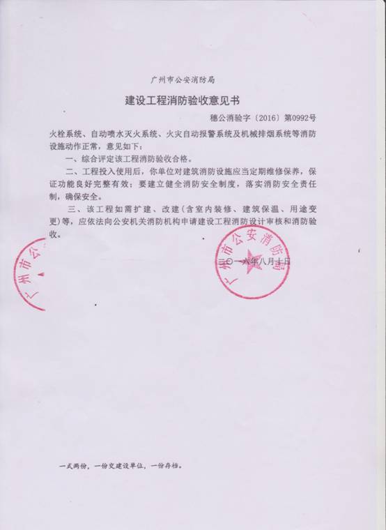 由广州市公安消防局验收、出具的意见书显示:综合评定该工程消防验收合格。